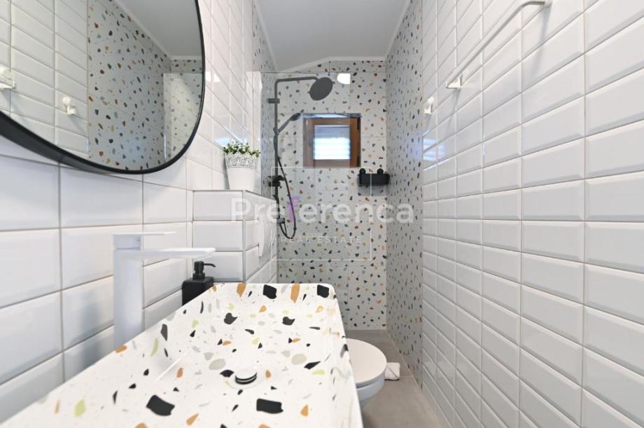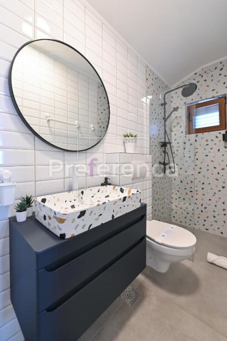 Ova moderna kamena vila s orijentacijom prema sjeverozapadu, idealno pozicionirana za maksimalno iskorištavanje prirodnog svjetla. Unutrašnjost je opremljena vrhunskim namještajem, sve prostorije klimatizirane. Villa ima prostranu terasu i dvorište, savršenim za opuštanje na otvorenom. U sklopu nekretnine nalazi se i parkiralište za dva automobila.