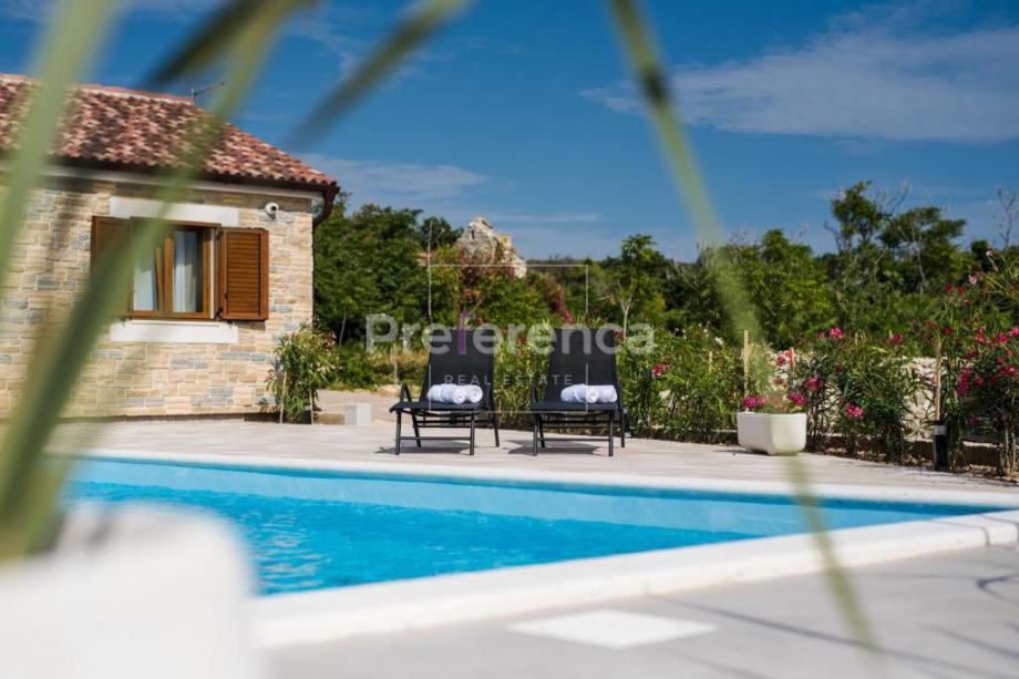 Kamena villa s bazenom, veličine 85m2 sastoji se od dvije spavaće sobe, kuhinje s blagovaonicom, dnevne sobe, dvije kupaonice.