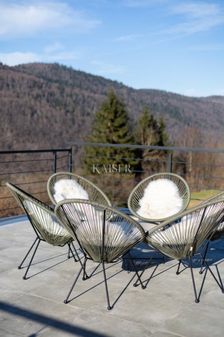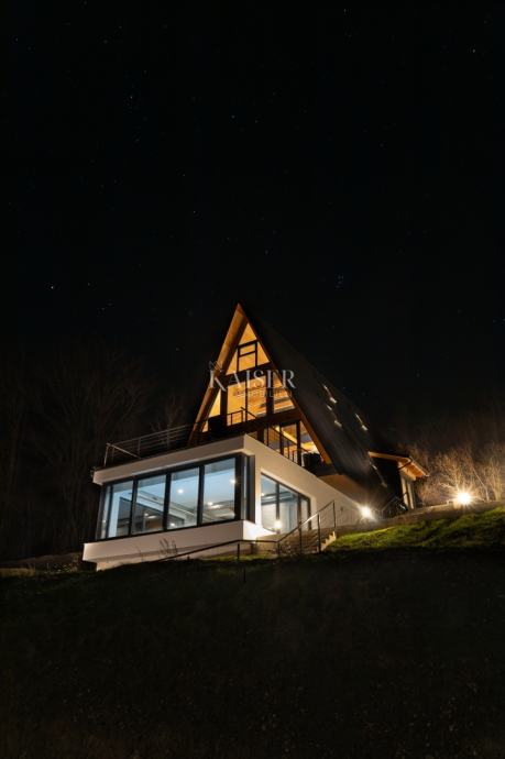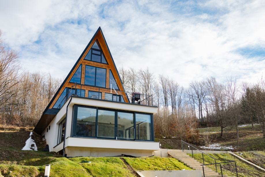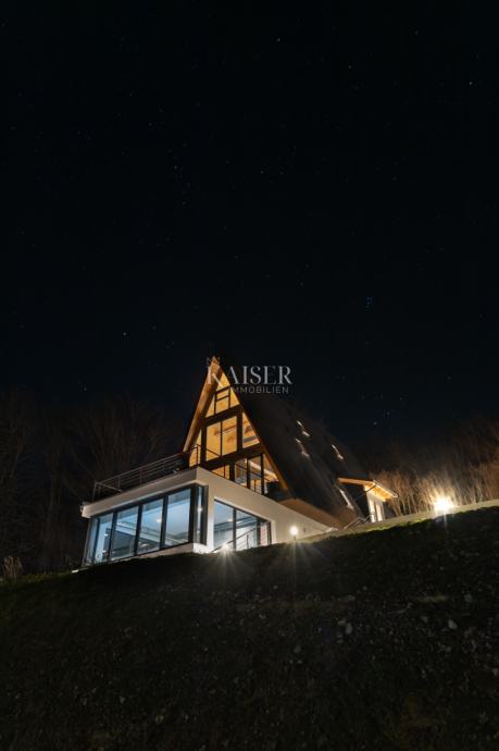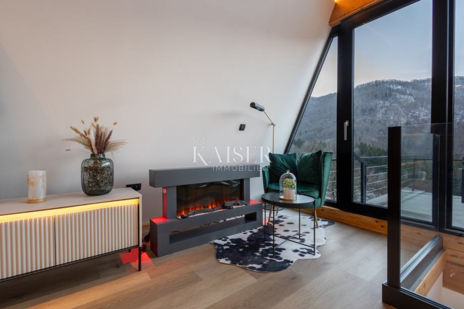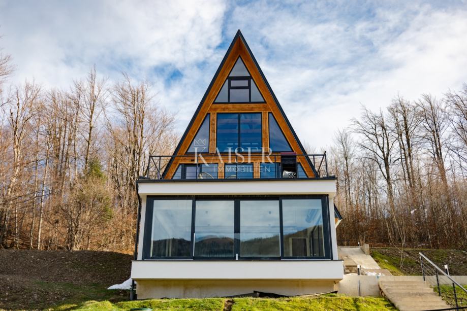 Kaiser Immobilien agencija predstavlja ekskluzivnu planinsku A-frame vilu s unutarnjim bazenom, wellnesom i očaravajućim pogledom u okolici Delnica.