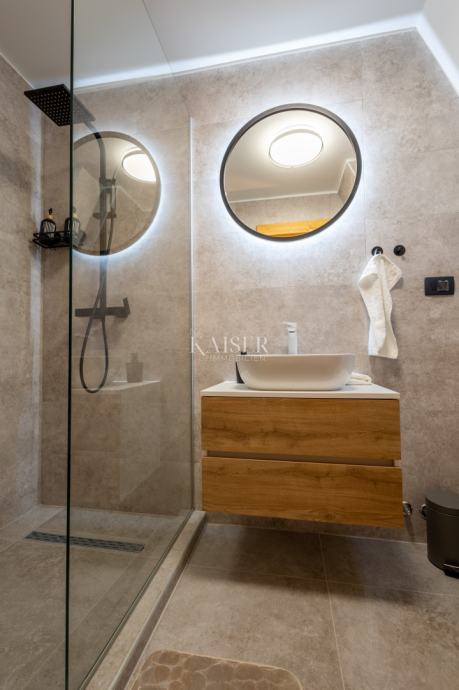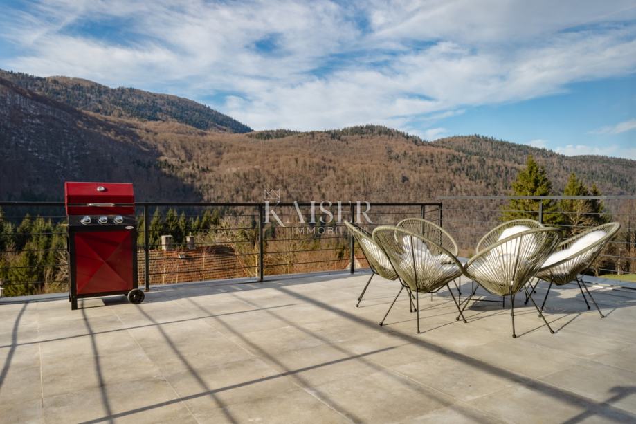 Prizemlje, površine veće od 110 m², oblikovano je kao prostran i iznimno svijetao open-space prostor koji povezuje kuhinju, blagovaonicu i dnevni boravak. Iz ovog dijela izlazi se na veliku, nenatkrivenu terasu s koje se pruža nesmetan pogled na netaknutu prirodu i brežuljke Gorskog kotara. Na istoj etaži nalaze se dvije udobne spavaće sobe, svaka s vlastitom kupaonicom.