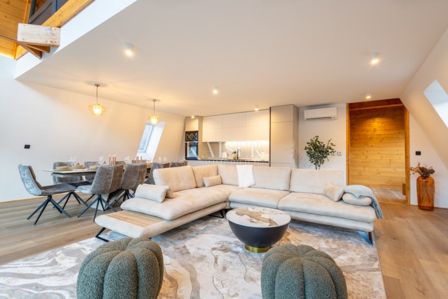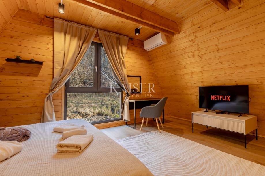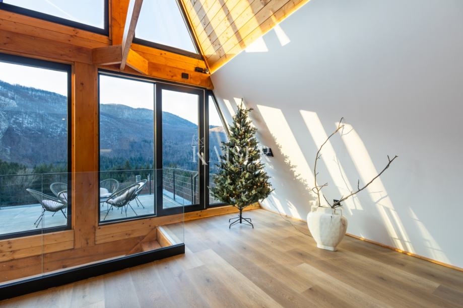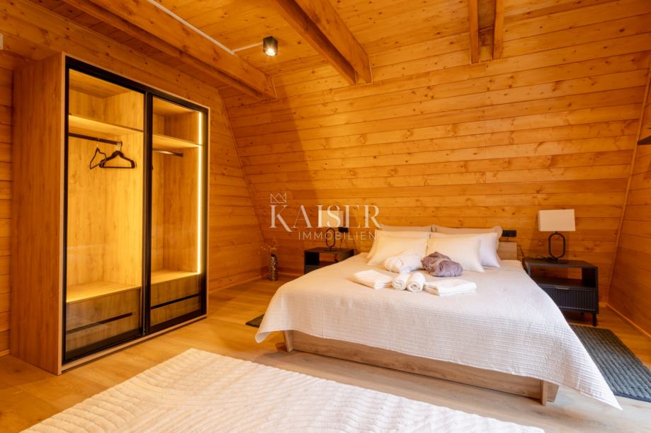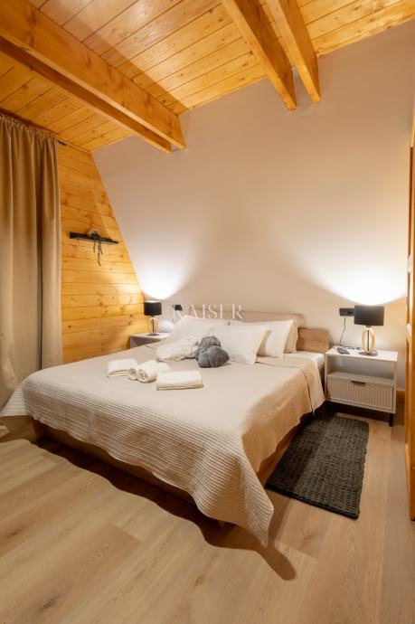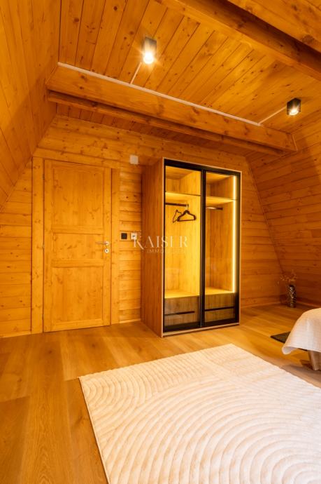 Na gornjim etažama – potkrovlju i tavanu – smještene su još tri spavaće sobe i dodatna kupaonica. Posebnu čar pruža tavanski prostor površine oko 40 m², uređen kao intimna spavaća ili lounge zona, s panoramskim prozorima koji uokviruju šumski pejzaž i stvaraju osjećaj boravka u prirodi, čak i iz topline interijera.
