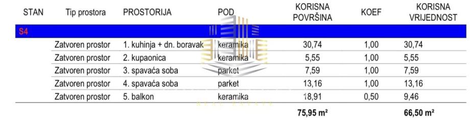 Na prvom katu moderne novogradnje u Diklu (stan S4) nalazi se elegantan stan ukupne neto površine 74,21 m² s pripadajućim dijelovima.
