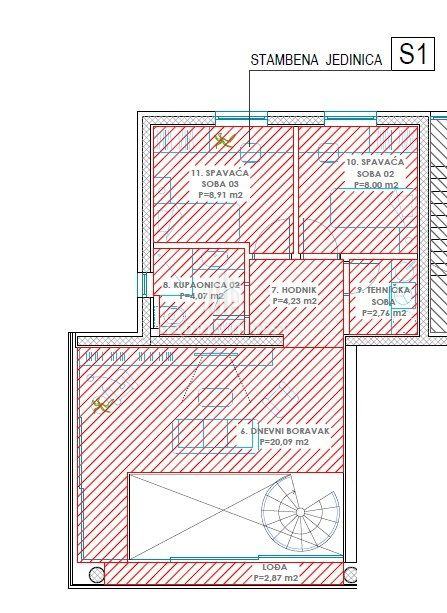 Stan oznake S1 nalazi se na prizemlju i na 1. katu objekta. Na prizemnoj etaži stana su hodnik, wc, spavaća soba 1, kupaonica 1, kuhinja, blagovaonica i dnevni boravak i lođa. Na prvoj etaži su dnevni boravak, hodnik, kupaonica 2, tehnička soba, spavaća soba 2, spavaća soba 3 i lođa.