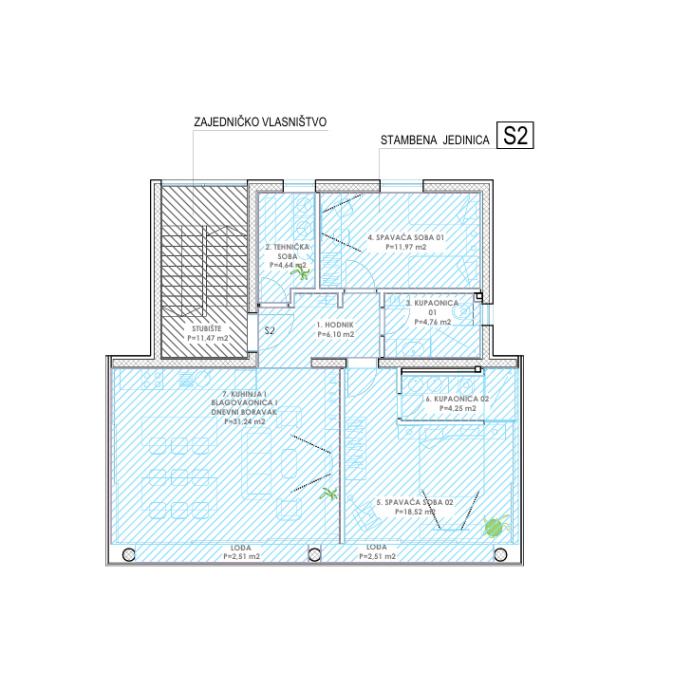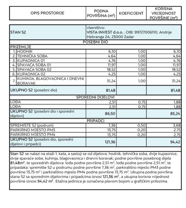 Diklo, dvosoban stan oznake S2 na 1. katu novogradnje. Predmetna stambena građevina sastoji se od tri stambene jedinice. U prizemlju se nalazi stan 1, na 1. katu se nalazi stan 2, a na 2. katu se nalazi stan 3 dok su u podrumu smještena spremišta i dodatni sadržaji. Stan S2 se nalazi na etaži 1. kata, a sastoji se od dijelova: hodnik, tehnička soba, dvije spavaće sobe, dvije kupaonice, kuhinja, blagovaonica i dnevni boravak, te dvije lođe, ukupno stambeno 85,24 m2. Pripada mu spremište i dva parkirališna mjesta, ukupno sa pripatcima etažna jedinica stana S2 će imati 94,42 m2. Ugrađivat će se: - najkvalitetnija aluminijska stolarija na tržištu - harmo aluminijska sjenila (mogućnost potpune zaštite od sunca) - podno grijanje na principu dizalice topline u svim prostorijama - kondicioniranje zraka uz pomoć dizalice topline (grijanje i hlađenje, multi split sustav) -vrhunska talijanska keramika - sanitarije renomiranih svjetskih proizvođača - videoparlafon - sobna vrata sa skrivenim okovima - protuprovalna ulazna vrata. Završna obrada interijera uključuje vrhunske materijale; talijansku keramiku, višeslojni hrastov parket, alu stolariju, sanitarije renomiranih proizvođača kao što su Laufen i Hansgrohe, te dizajnerska unutarnja vrata. Ova nekretnina pruža idealan dom za obitelj no i mogućnost korištenja za nekretninu za odmor ili iznajmljivanja u turizmu. Investitor je firma te kupac ne plaća porez na promet nekretnina. Predviđeno useljenje i završetak je do kraja 2026. godine. Više informacija na upit.