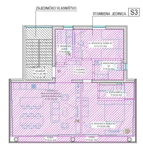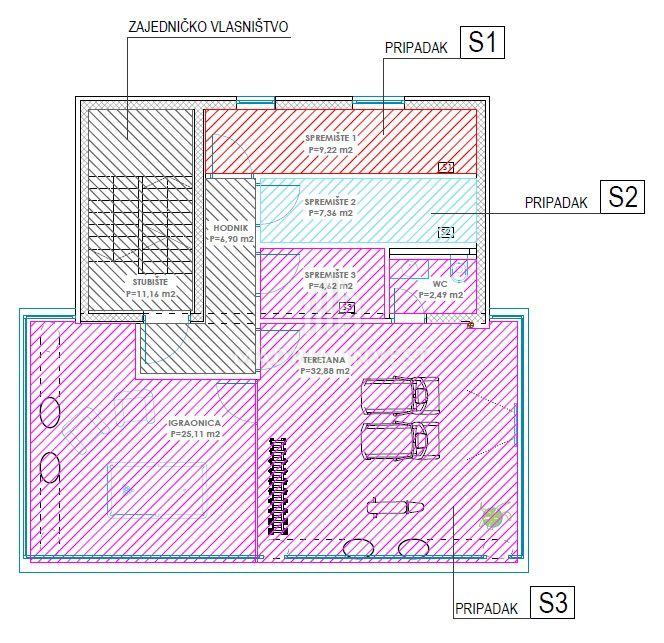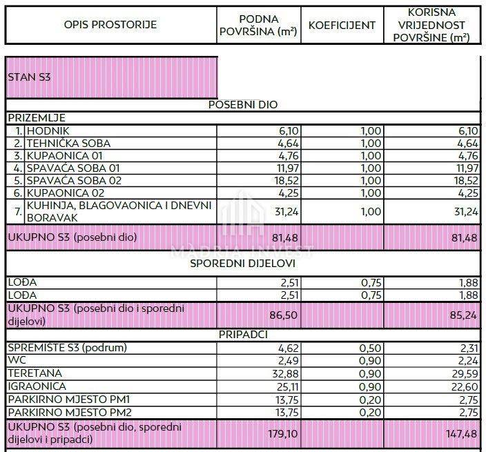 Penthouse oznake S3 nalazi se na 2. katu objekta i prostire se po cijeloj etaži. Stan sačinjava hodnik, tehnička soba, kupaonica 1, spavaća soba 1, spavaća soba 2, kupaonica 2, kuhinja, blagovaonica i dnevni boravak i dvije lođe. Posebnost ove nekretnine su pripadci u vidu teretane, igraonice i wc-a u podrumu zgrade. Uz navedeno, stanu pripada spremište u podrumu, parkirno mjesto PM1 i parkirno mjesto PM2.