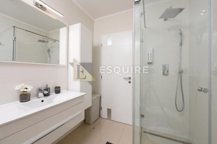 Stan ima poseban, privatni ulaz odvojen od ulaza u zgradu, a sastoji se od hodnika, kuhinje povezane s blagovaonicom i dnevnim boravkom, dvije spavaće sobe (od kojih jedna ima vlastitu kupaonicu), dodatne kupaonice, spremišta te prostrane terase opremljene jacuzzijem.