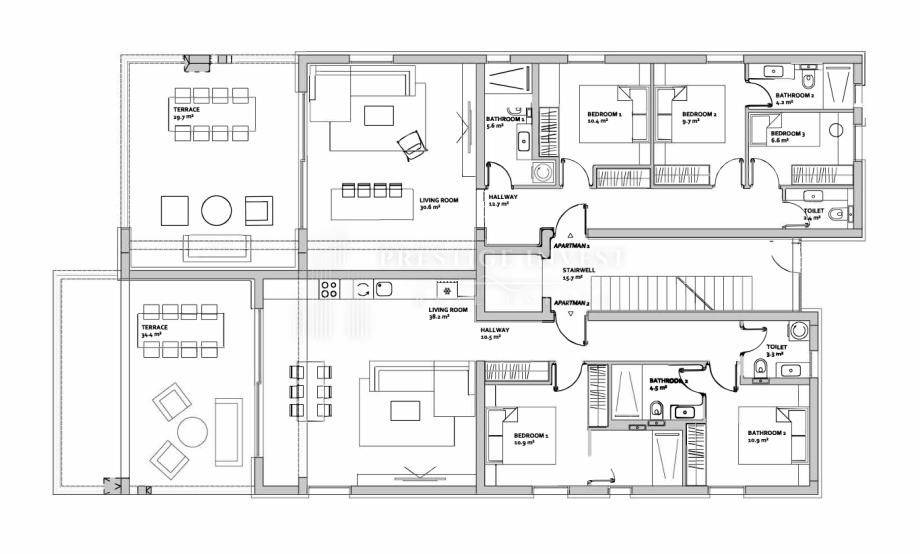 Zgrada ima ukupno 6 stanova, s time da četiri stana imaju vlastite bazene.