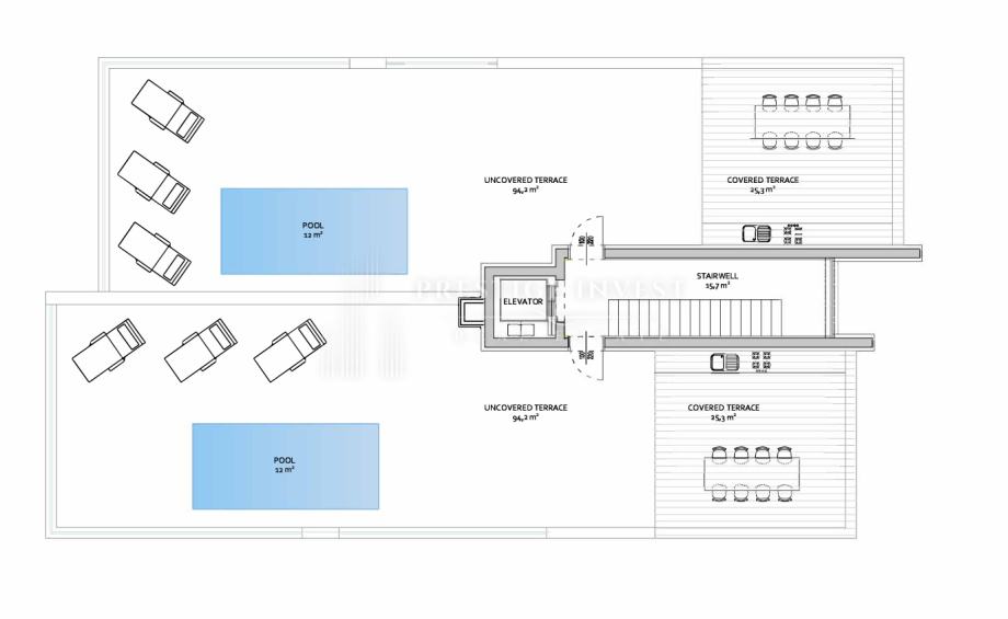 Stanovi na drugom katu imaju krovnu terasu s mogućnošću dodatne opreme (npr. infinity bazen ili jacuzzi, tuš, ljetna kuhinja, bioklimatska pergola).