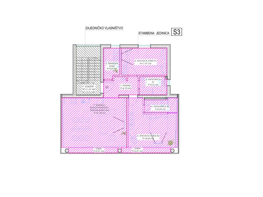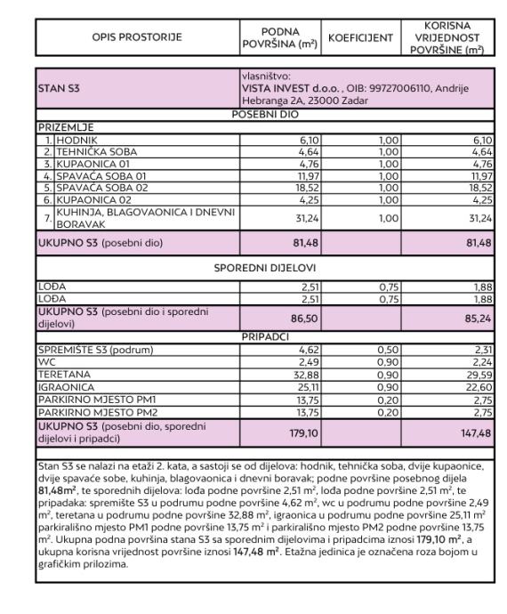 Diklo, dvosoban penthouse s teretanom i spremištem, te predivnim pogledom!! Predmetna stambena građevina sastoji se od tri stambene jedinice. U prizemlju se nalazi stan 1, na 1. katu se nalazi stan 2, a na 2. katu se nalazi stan 3 dok su u podrumu smještena spremišta i dodatni sadržaji. Stan S3 se nalazi na cijeloj etaži 2. kata, a sastoji se od dijelova: hodnik, tehnička soba, dvije spavaće sobe, dvije kupaonice, kuhinja, blagovaonica i dnevni boravak, sporednih dijelovate dvije lođe, ukupno 85,24 m2. Dodatno mu u suterenu pripadaju spremište, wc, teretana i igraonica , te dva parkirališna mjesta. Ukupno će etažna jedinica stana oznake S3 imati 147,48 m2. Ugrađivat će se: - najkvalitetnija aluminijska stolarija na tržištu - harmo aluminijska sjenila (mogućnost potpune zaštite od sunca) - podno grijanje na principu dizalice topline u svim prostorijama - kondicioniranje zraka uz pomoć dizalice topline (grijanje i hlađenje, multi split sustav) -vrhunska talijanska keramika - sanitarije renomiranih svjetskih proizvođača - videoparlafon - sobna vrata sa skrivenim okovima - protuprovalna ulazna vrata. Završna obrada interijera uključuje vrhunske materijale; talijansku keramiku, višeslojni hrastov parket, alu stolariju, sanitarije renomiranih proizvođača kao što su Laufen i Hansgrohe, te dizajnerska unutarnja vrata. Ova nekretnina pruža idealan dom za obitelj no i mogućnost korištenja za nekretninu za odmor ili iznajmljivanja u turizmu. Investitor je firma te kupac ne plaća porez na promet nekretnina. Predviđeno useljenje i završetak je do kraja 2026. godine. Više informacija na upit.