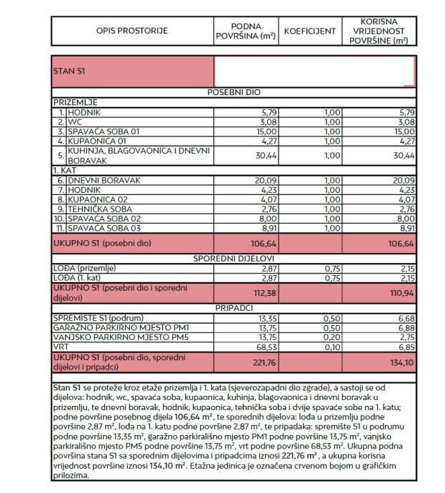 U prvoj zgradi na prodaju je dvoetažan stan oznake S1 koji se proteže na prizemlje i prvi kat, te nudi savršen spoj komfora, modernog dizajna i privatnosti. U prizemlju ; ulazni hodnik, WC, spavaća soba, kupaonica te prostran open-space dnevni boravak s kuhinjom i blagovaonicom. Iz dnevnog prostora izlazi se na lođu i u vlastiti vrt površine 68,53 m². Na katu se nalaze dodatni dnevni boravak, dvije prostrane spavaće sobe, još jedna kupaonica, hodnik i tehnička soba, kao i druga lođa. Ukupna korisna vrijednost stana iznosi 134,10 m², dok ukupna podna površina sa svim pripacima iznosi čak 221,76 m²(u privitku elaborat etažiranja i tlocrt). Stanu pripadaju i dva parkirna mjesta – jedno u podzemnoj garaži, a drugo vanjsko, kao i spremište u suterenu zgrade. Završna obrada interijera uključuje vrhunske materijale – talijansku keramiku, višeslojni hrastov parket, alu stolariju, sanitarije renomiranih proizvođača kao što su Laufen i Hansgrohe, te dizajnerska unutarnja vrata. Ova nekretnina pruža idealan dom za obitelj no i mogućnost korištenja za nekretninu za odmor ili iznajmljivanja u turizmu. Investitor je firma te kupac ne plaća porez na promet nekretnina. Predviđeno useljenje i završetak je do kraja 2026. godine. Više informacija na upit.