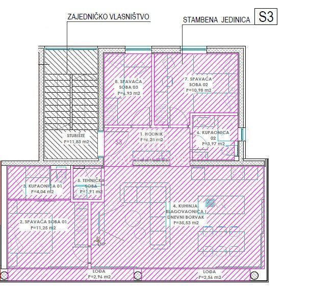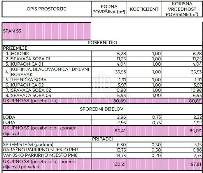 Stan oznake S3 nalazi se na prvom katu objekta. Stan sačinjava hodnik, spavaća soba 1, kupaonica 1, kuhinja, blagovaonica i dnevni boravak, tehnička soba, kupaonica 2, spavaća soba 2, spavaća soba 3 i dvije lođe.