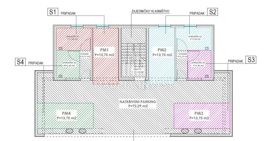 Stanu pripada spremište u podrumu, jedno garažno parkirno mjesto i jedno vanjsko parkirno mjesto.