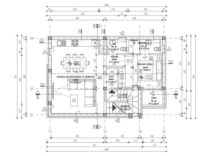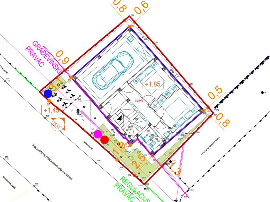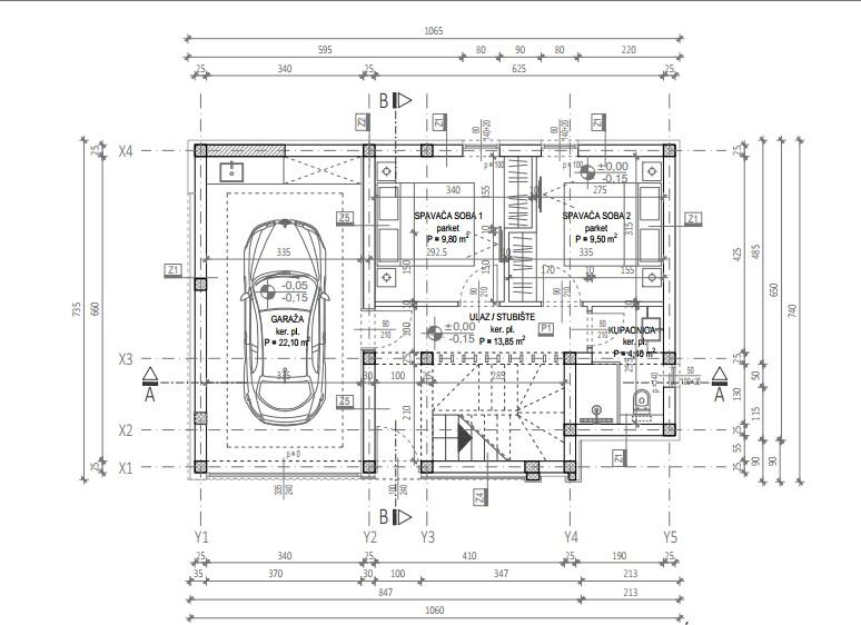 U prizemlju se nalazi garaža, ulaz/stubište, dvije spavaće sobe i kupaonica. Na 1.katu se nalaze kuhinja, blagovaonica, d.boravak, hodnik, wc, kupaonica, spavaća soba, ostava i balkon.