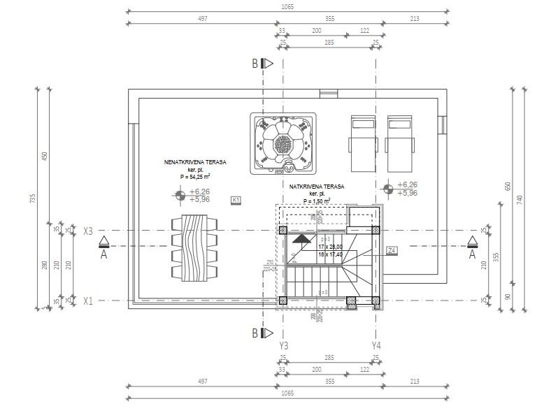 Villa se satoji od dvije etaže (P+1) sa izlazom na ravni prohodni krov, tlocrtnih dimenzija 10,60 x 7,35 m, izgrađena na zemljištu od 130m2.