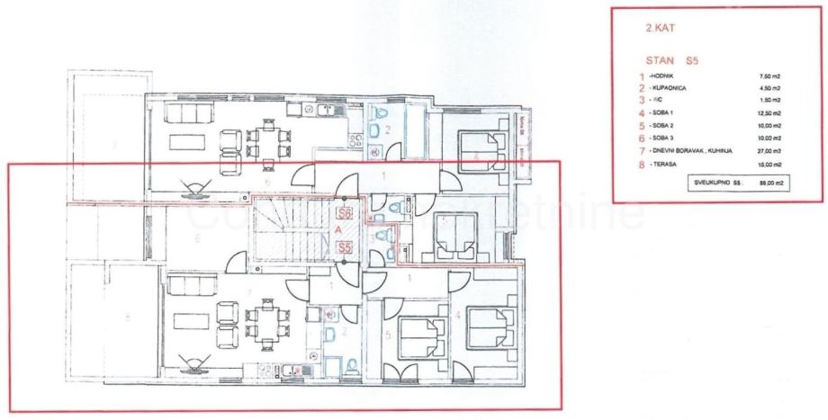 Neto površina ovog stana iznosi 93,22 m2. Sastoji se od: dnevnog boravka, kuhinje s blagovaonicom, tri spavaće sobe, kupaonice, toaleta, hodnika te terase površine 15 m2. Pripada mu spremište u podrumu zgrade i jedno parkirno mjesto u dvorištu zgrade.