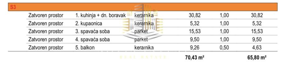 Ukupna neto površina s pripadajućim dijelovima: 76,97 m²