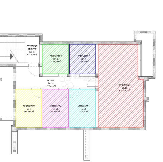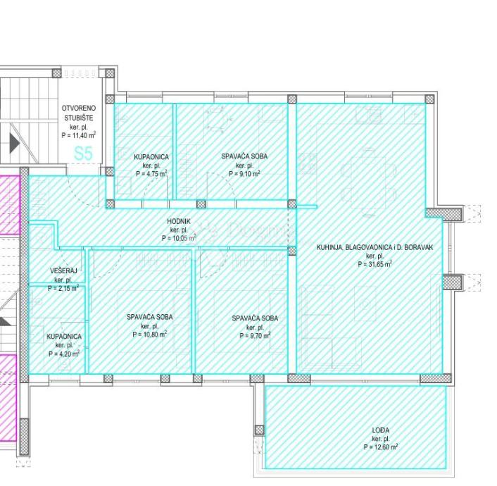 Unutarnja stambena površina: 82,40m2. Ukupna brutto površina sa svim pripadcima 233,65m2, tj. 127,34m2 netto prodajne površine.