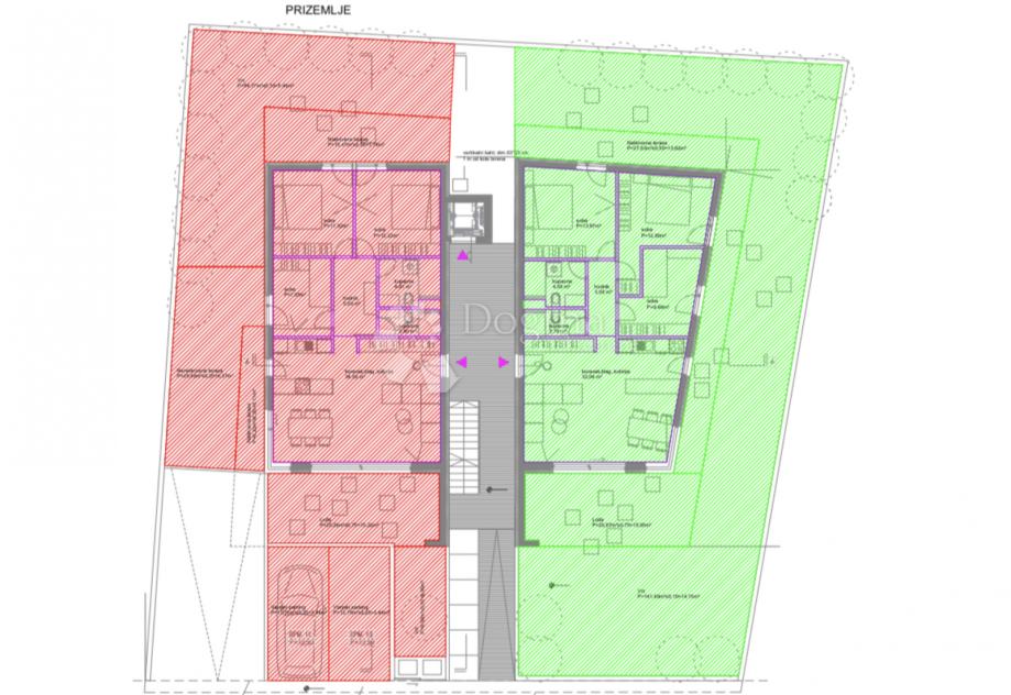 Svaki kat se sastoji od dva velika trosobna stana. Apartmani u prizemlju imaju vrt, a apartmani na drugom katu krovnu terasu s pogledom na more. Svaki stan ima dva parkirna mjesta u garaži. Zgrada ima lift, što budućim stanarima olakšava svakodnevni život i pruža im još jedan osjećaj ugode.