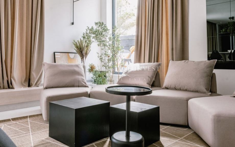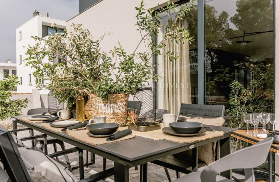 Eksterijer ove moderne nekretnine pruža divan prostor za opuštanje, s prostranom terasom, vanjskim blagovaoničkim prostorom i roštiljem, vanjskim bazenom, sunčalištem s ležaljkama, jacuzzijem i vrtom u mediteranskom stilu. Vanjski dio također ima dva parkirna mjesta.