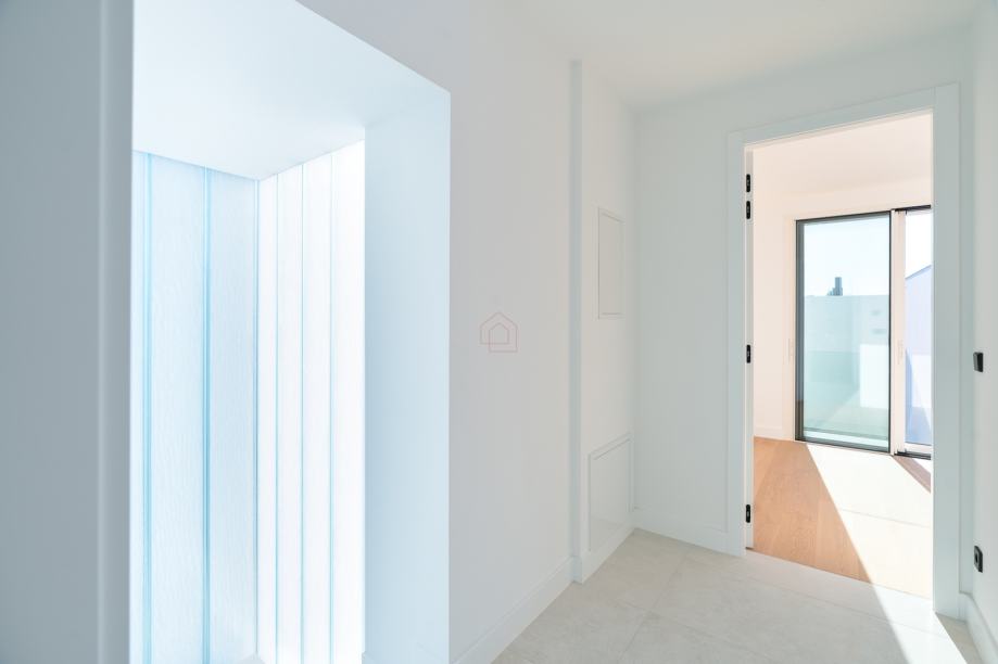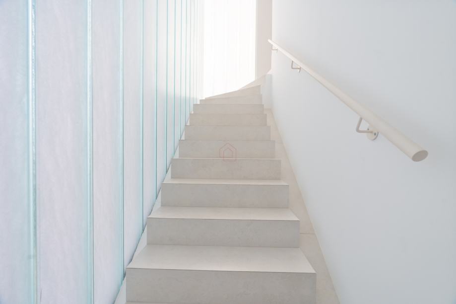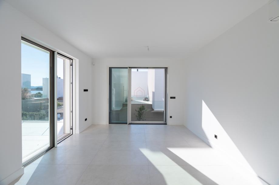 Stan se odlikuje pažljivo osmišljenim rasporedom prostorija: tri spavaće sobe (6,95 m2, 13,52 m2 i 14 m2), prostrani dnevni boravak s kuhinjom i blagovaonicom od 24,88 m2, tri kupaonice (4,95 m2, 4,74 m2 i 4,25 m2), dva hodnika (4,23 m2 i 4,95 m2) te stubište od 6,36 m2. Orijentacija na jug, jugozapad i zapad omogućava obilje prirodnog svjetla tijekom cijelog dana, ističući vrlo sunčanu atmosferu stana te pružajući lijep pogled i panoramu na more.