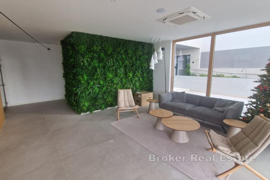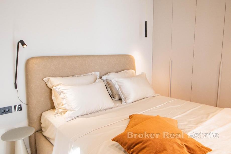 Za najam, dizajnerski dvosobni stan koji se smjestio u zgradi novije gradnje, koja se nalazi u blizini žnjanske plaže. Nekretnina odiše modernim uređenjem, privatnošću i mirom što je čini idealnom nekretninom za svakodnevno življenje bilo da je riječ o urbanom ili mirnom životu. Nekretnini pripadaju također dva garažna parking mjesta što doprinosi komforu samog boravka.