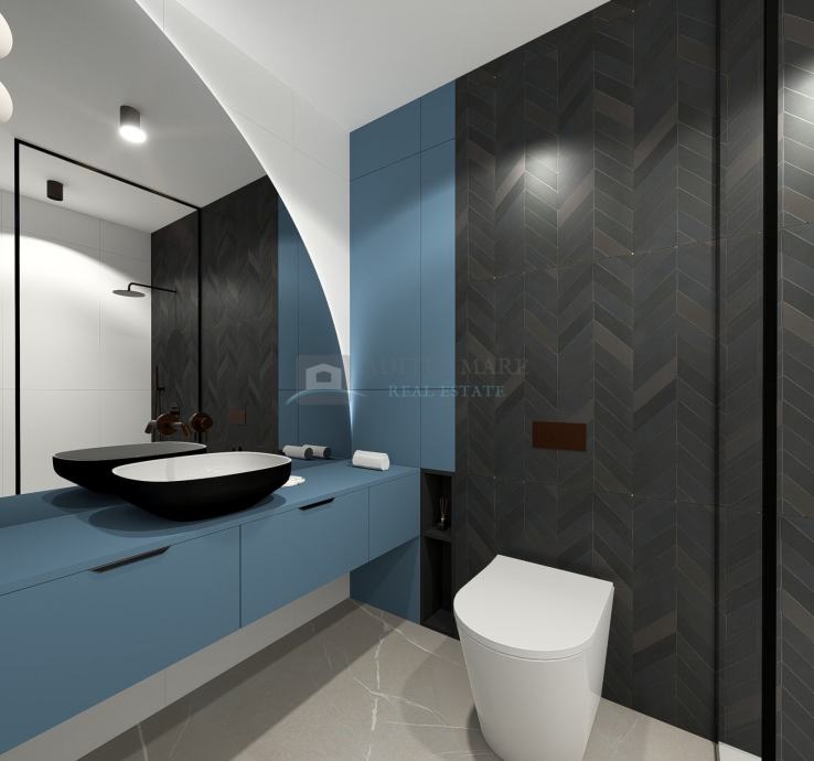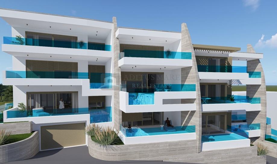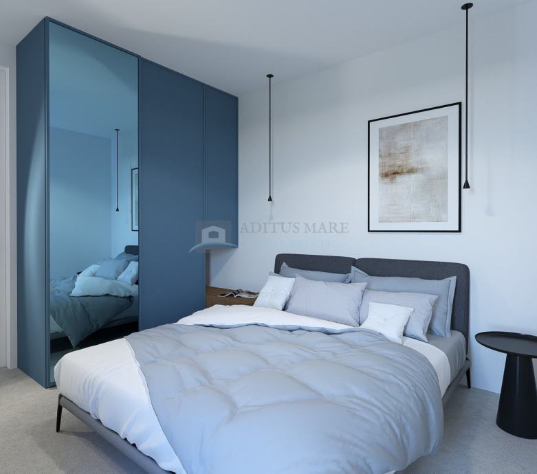 Ono što ovaj stan čini posebitim je otvoreni prostor kuhinje i dnevnog boravka koji vodi na terasu s bazenom i pogledom na more, dvije spavaće sobe od kojih jedna ima balkon iz kojega se također prostire pogled na more. U ovoj fazi gradnje potencijalnim kupcima je omogućeno sudjelovanje u uređenju interijera prema vlastitim željama.