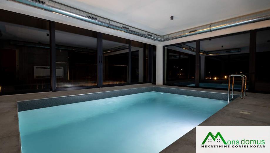 Parking je vanjskim stepeništem povezan s prizemljem kuće gdje je i glavni ulaz. U prizemlju se nalaze dvije spavaće sobe sa vlastitim kupaonicama te veliki, otvoreni prostor gdje je kuhinja, blagovaonica te dnevni boravak. Iz navedenog prostora izlaz je na prostranu, nenatkrivenu terasu te stepenište do suterena u kojem je ostakljeni wellness prostor s grijanim bazenom. U potkrovlju i tavanu su ukupno još tri spavaće sobe i jedna kupaonica.