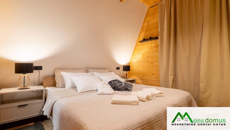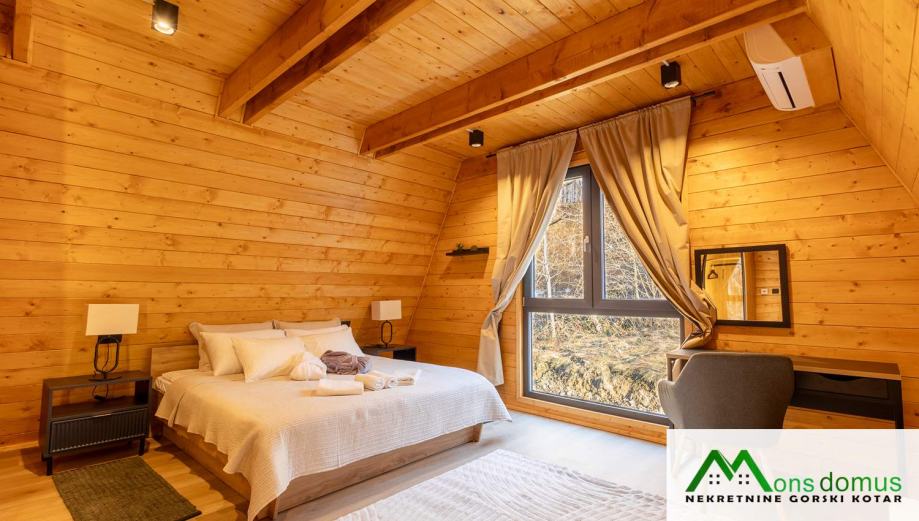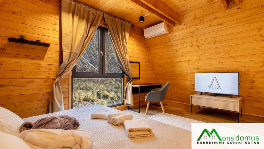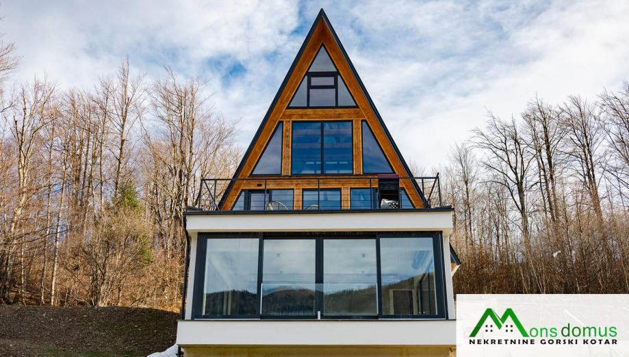 Na nadmorskoj visini od 510 metara i građevinskom zemljištu površine 1088 m2, smještena je nova, kvalitetno građena A-frame kuća sa unutarnjim bazenom. Nalazi se na brdašcu iznad asfaltirane prometnice te se sastoji od suterena, prizemlja, potkrovlja i tavana. Suteren je betonski, dok je ostatak kuće drven, izoliran kamenom vunom od 30 cm te prekriven limom.