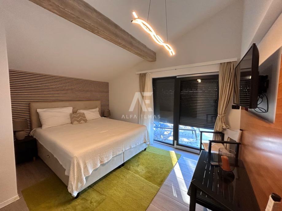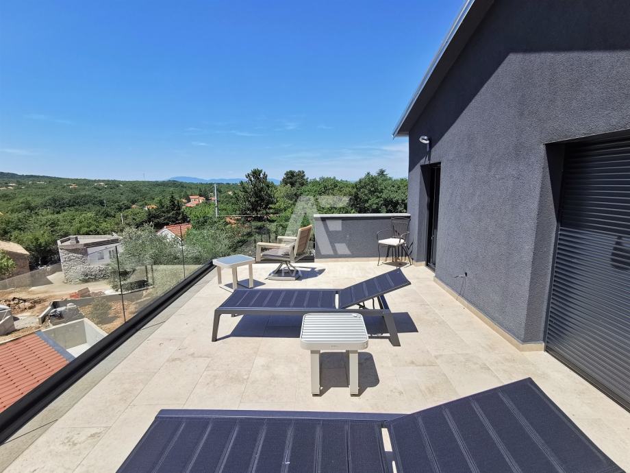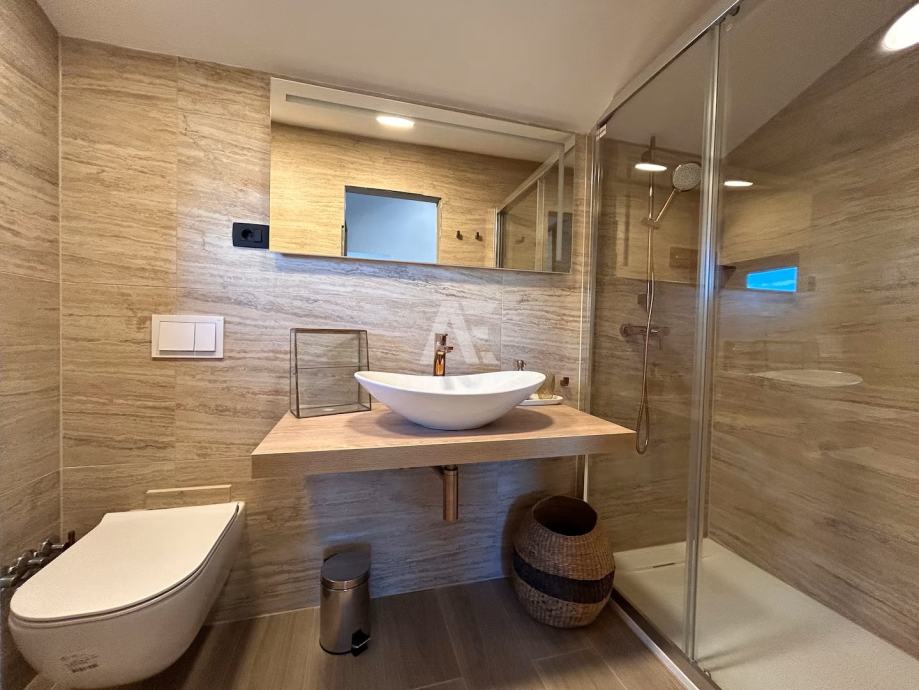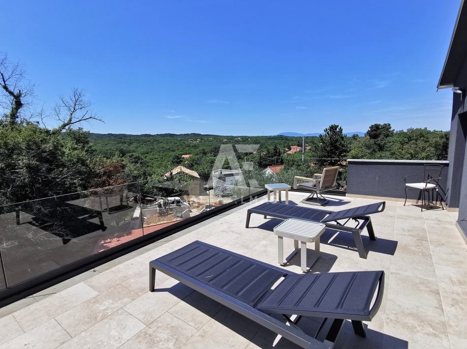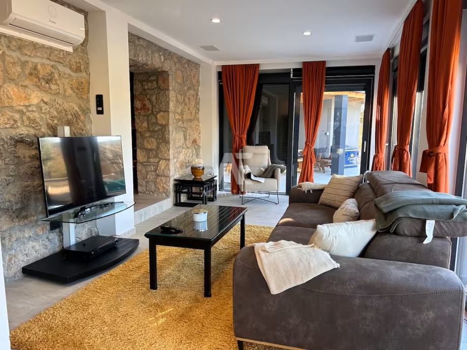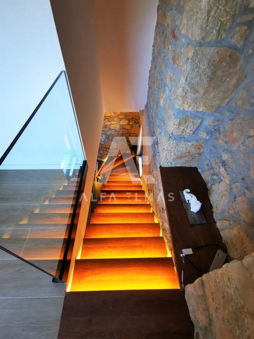 Kuća se prostire na tri etaže (P+2). U prizemlju se nalazi prostrani dnevni boravak, kuhinja s blagovaonicom, veranda, WC te unutarnje stubište koje vodi na kat. Prvi kat obuhvaća tri elegantne spavaće sobe i modernu kupaonicu, dok se na drugom katu smjestila još jedna spavaća soba s vlastitom kupaonicom i terasom. S terase se pruža očaravajući panoramski pogled na netaknutu prirodu, planine i more.