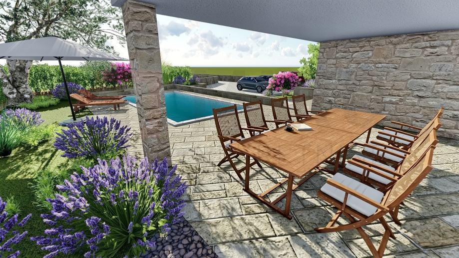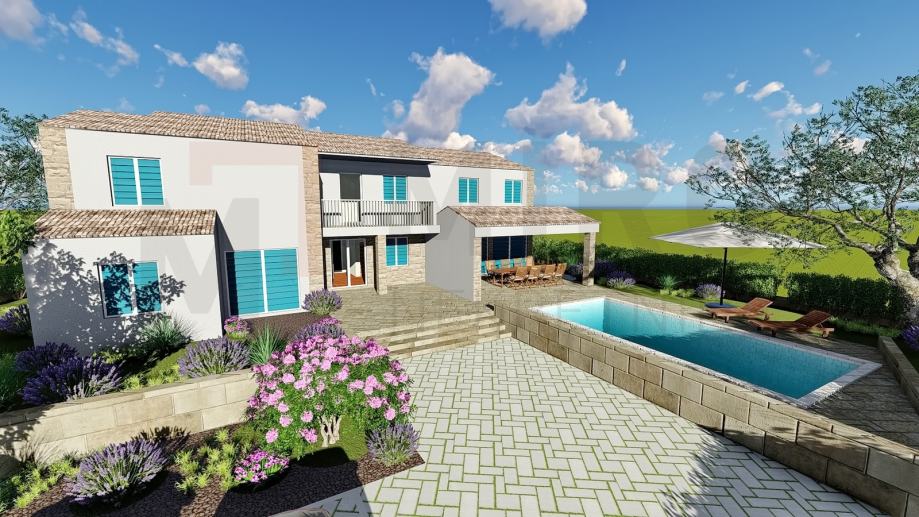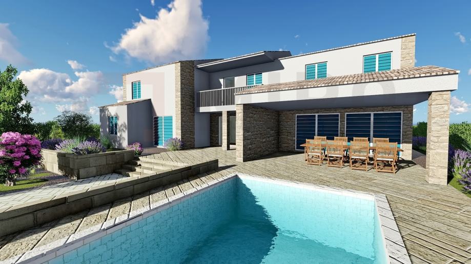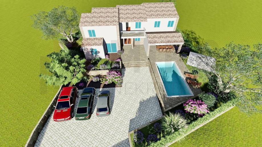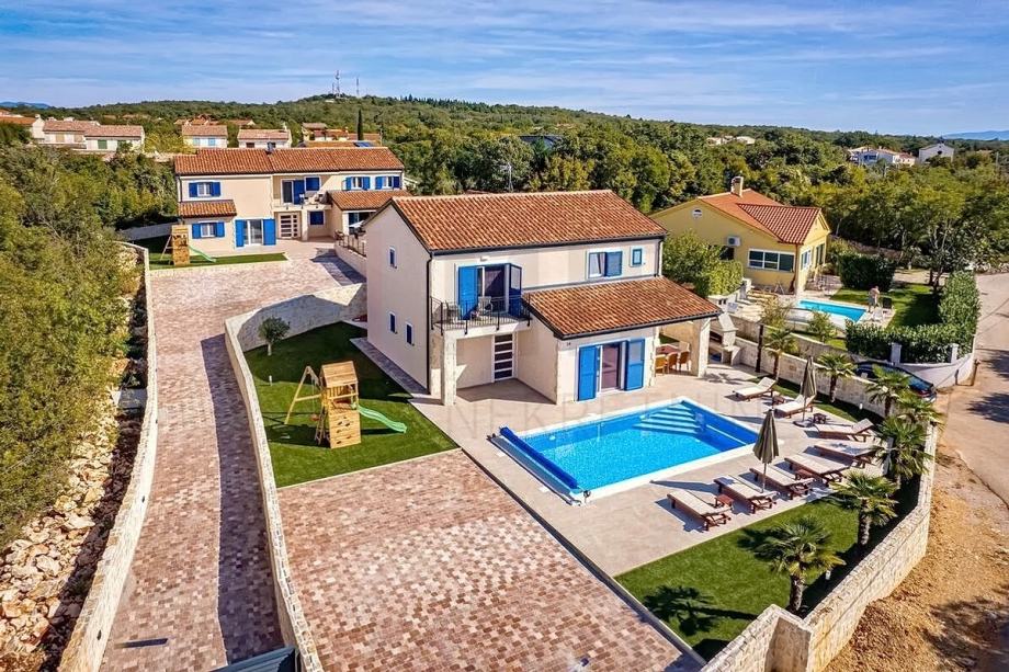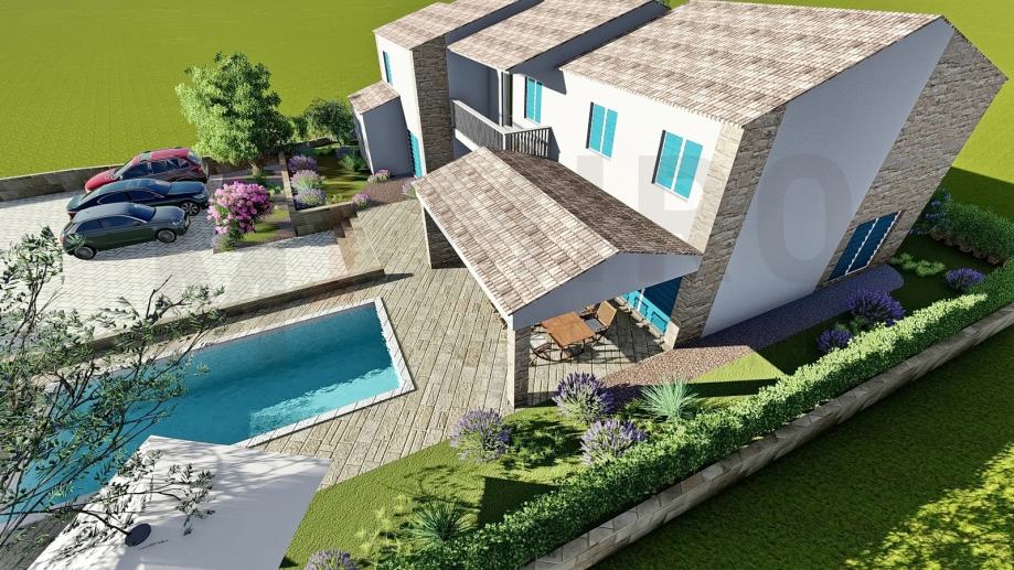 Otok Krk, Dobrinj, šira okolica, novoizgrađena kuća mediteranskog stila s bazenom. U unutrašnjosti otoka Krka prodaje se novogradnja iznimne kvalitete. Nekretnina se proteže kroz tri etaže, podrum, prizemlje i prvi kat. Sastroji se od četiri spavaće sobe s vlastitim kupaonicama i radna soba nalaze se na prvom katu. U prizemlju je još jedna spavaća soba s vlastitom kupaonicom, vešeraj, spremište i wc za goste i veliki prostor otvorenog koncepta koji objedinjuje kuhinju blagovaonu i dnevni boravak iz kojeg se pristupa natkrivenoj terasi te okućnici s grijanim bazenom od 32m2. U podrumu je smještena dodatna prostorija za druženje.Sve prostorije u kući će biti klimatizirane dok će kuća biti opremljena i dizalicama topline za podno grijanje i toplu vodu. U cijeni je i PDV te kupac ne plaća 3 % poreza na promet nekretnina. Posjetite nas i pronađite kvadrat vašeg doma!