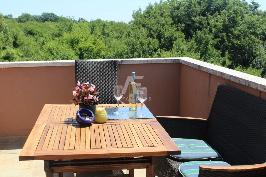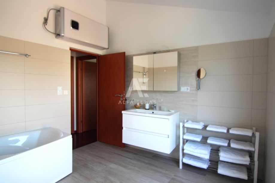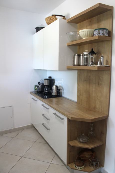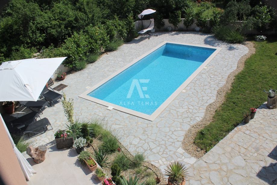 Kuća se sastoji od ulaznog hodnika, kupaonice, kuhinje i dnevnog boravka s blagovaonicom u prizemlju, te dvije spavaće sobe, kupaonice i nenatkrivene terase na katu. Iz prizemne etaže se također pruža izlaz na terasu, potpuno natkrivenu, što omogućuje boravak na otvorenom u raznim vremenskim prilikama. Terasa s stapa sa uređenim vrtom koji je obogaćen mediteranskim biljem i opremljen sustavom za navodnjavanje. Uz bazen veličine 8m X 4m sa protustrujnim plivanjem, se na okućnici se također nalaze spremište za alat obloženo kamenom i zidani roštilj te parking za dva automobila.