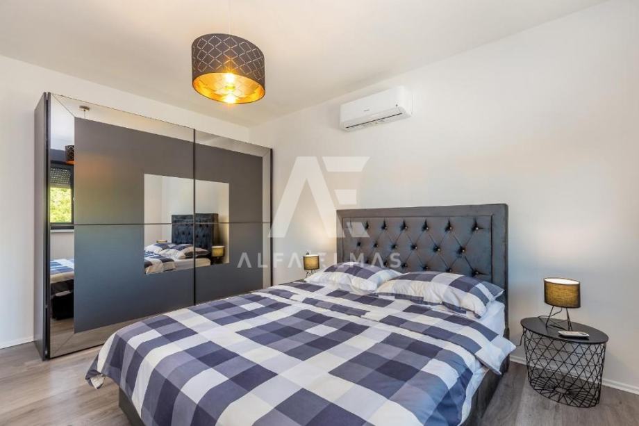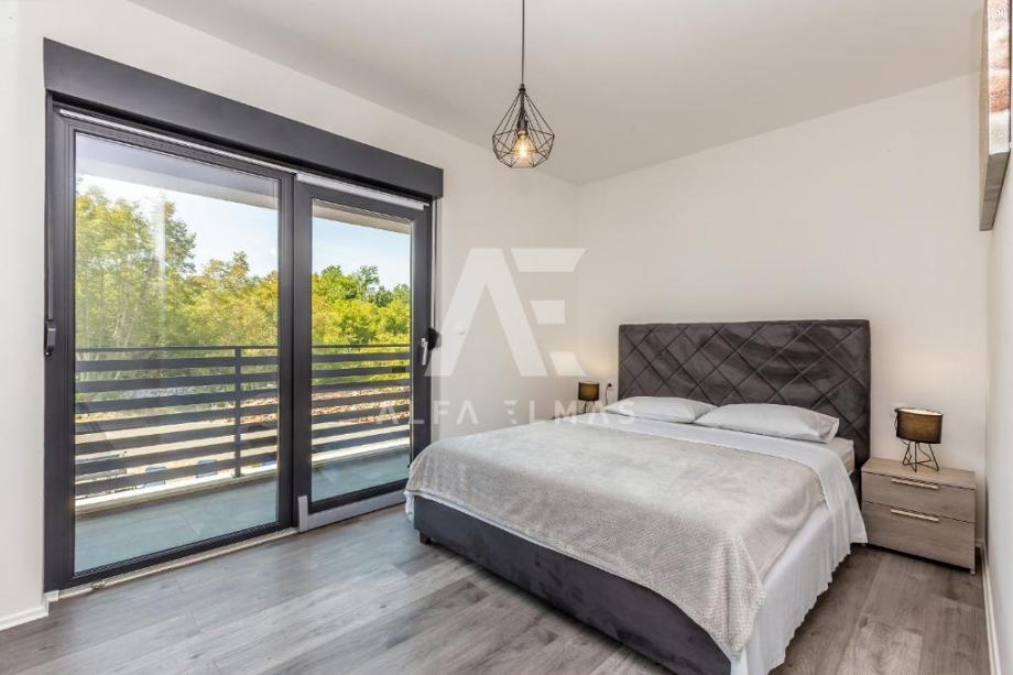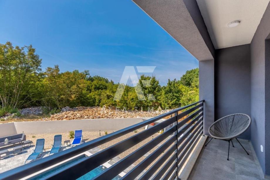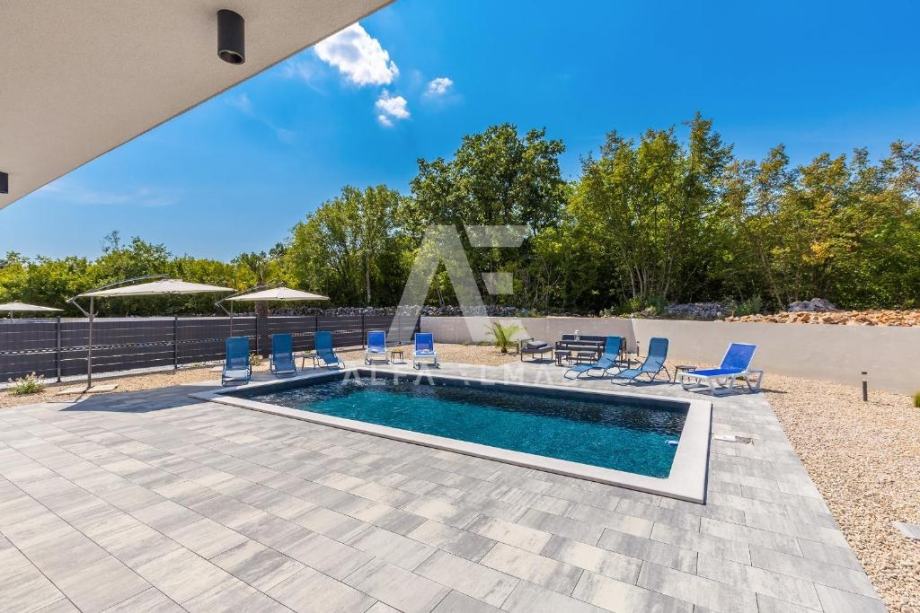 Dobrinj, okolica, luksuzna samostojeća vila na mirnoj lokaciji. Vila je katnosti prizemlje i prvi kat. U prizemlju se nalazi ulazni hodnik, kupaonica, ostava, te dnevni boravak, kuhinja i blagovaona koji čine cjelinu. Iz dnevnog se boravka pruža izlaz na natkrivenu terasu gdje se dalje nalazi sunčalište i bazen. Unutarnje stepenište dovodi na pri kat gdje se nalaze tri spavaće sobe, svaka sa svojim kupaonicom. Luksuzna vila ima ukupnu stambenu površine od 156m2, te se nalazi na parceli od 650m2. Okućnica vile u okolici Dobrinja je u potpunosti uređena, te je izvedeno parkirno mjesto za najmanje 3 vozila. Vila je u potpunosti opremljena, sadrži visokokvalitetnu keramiku, podne obloge i vrhunske uređaje. Dokumentacija uredna.