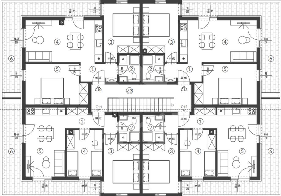 Stan C12 ukupne netto površine 54,84 m2 sastojat će se od ulaznog hodnika s prostorom za garderobu, dvije spavaće sobe, moderno uređene kupaonice, otvorenog dnevnog boravka s kuhinjom i blagovaonicom te natkrivene terase od 8,32 m2, idealne za opuštanje tijekom cijele godine. Ukupna obračunska površina stana iznosi 57,97 m2 ( uključujući parking ). Podne obloge bit će izvedene u kvalitetnoj keramici, koja prostoru daje moderan i profinjen izgled, a ujedno je praktična i dugotrajna za svakodnevno korištenje. Stan će biti opremljen klima uređajem za grijanje i hlađenje, osiguravajući ugodnu temperaturu tijekom cijele godine uz visoku energetsku učinkovitost. U kupaonici će biti ugrađeno podno grijanje, pružajući dodatnu razinu komfora, posebno u zimskim mjesecima. Cijela zgrada i stan biti će opremljeni kvalitetnom PVC stolarijom, koja osigurava izvrsnu toplinsku i zvučnu izolaciju, smanjuje potrošnju energije te doprinosi miru i privatnosti unutar prostora. Uz stan je osigurano parking mjesto što pruža dodatnu praktičnost i bezbrižnost u svakodnevnom životu.