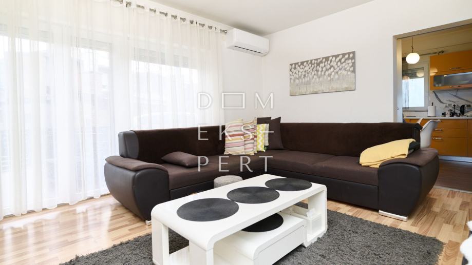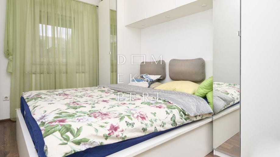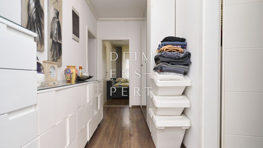 Trosoban stan sastoji se od ulaznog hodnika, ostave, vešeraja, dvije spavaće sobe, kuhinje s blagovaonicom i dnevnog boravka s izlazom na terasu.