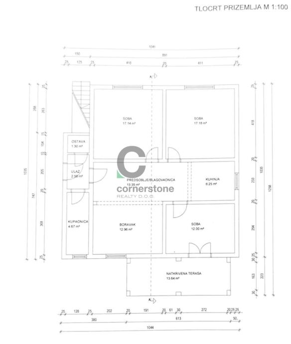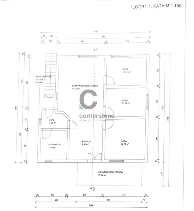 Prizemlje (stan 1) površine 94,25 m2 sastoji se od predsoblja/blagovaonice, kuhinje te sobe i boravka s izlaskom na natkrivenu terasu, navedenom pripadaju i dvije sobe koje su organizirane kao poslovni prostori.