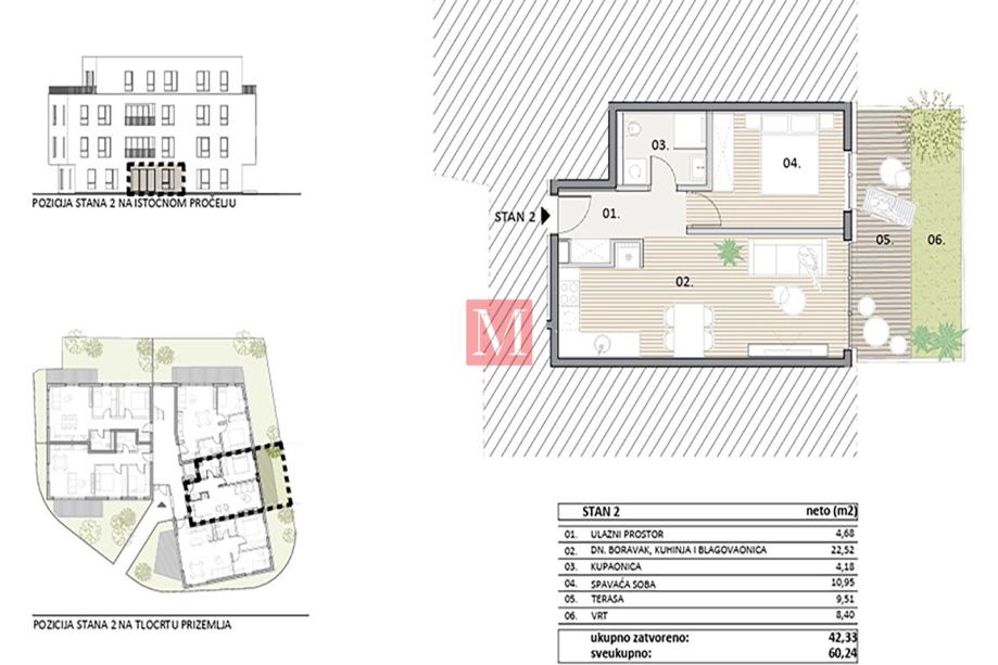 Stan 42,33 m2, + 9,51 m2 terase + 8,40 m2 vrta s parkirnim mjestom uključenim u cijenu.