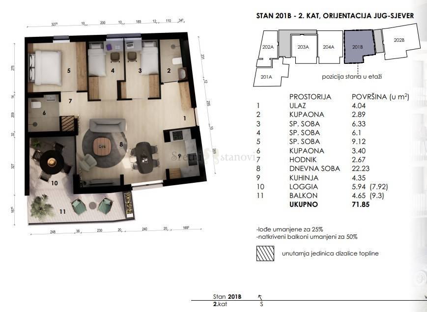 Ovaj stan se nalazi na 2. katu te je dvostrane orijentacije sjever-jug. Sastoji se od ulaznog hodnika, dnevnog boravka s kuhinjom i blagovaonom, 3 spavaće sobe, 2 kupaone i vanjskog dijela - prekrasne terase od 17,22 m2 koja je djelomično natkrivena te daje prostor loggie koja se nastavlja u nenatkriveni balkon.