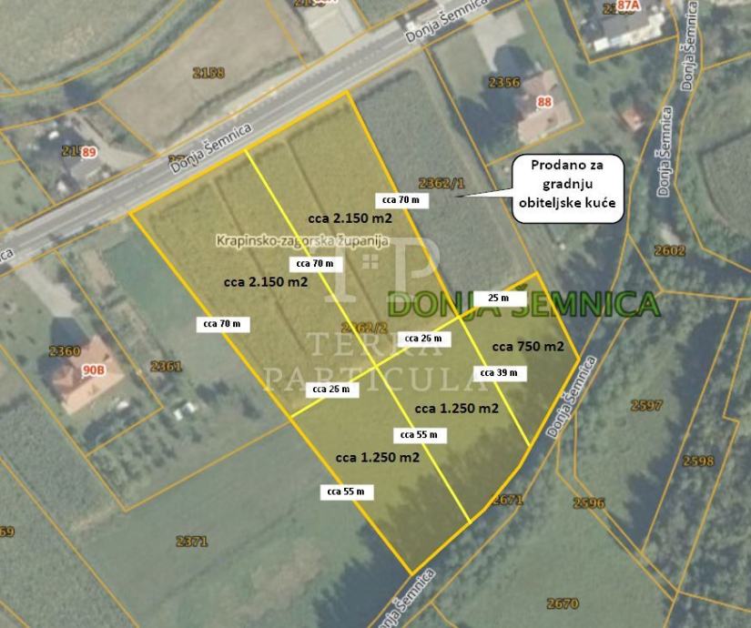 Na prodaju nudimo građevinsko zemljište površine 2.150 m². Nalazi se iz smjera Svetog Križa Začretja prema centru s desne strane iza kuće na adresi Donja Šemnica 90B. U blizini su svi priključci. Moguća kupnja i veće površine.