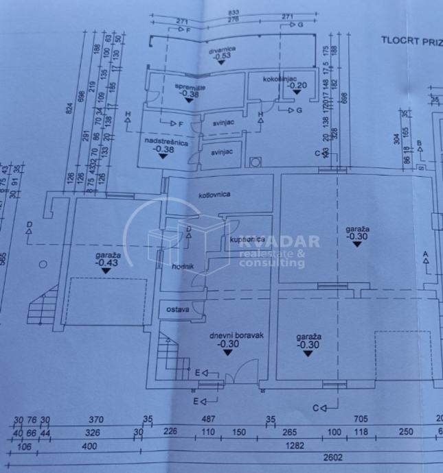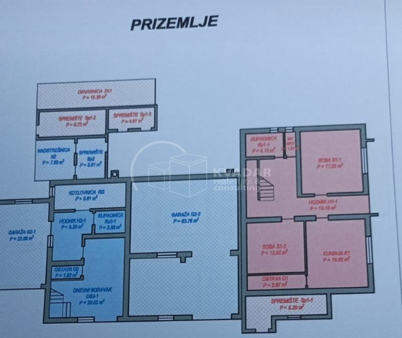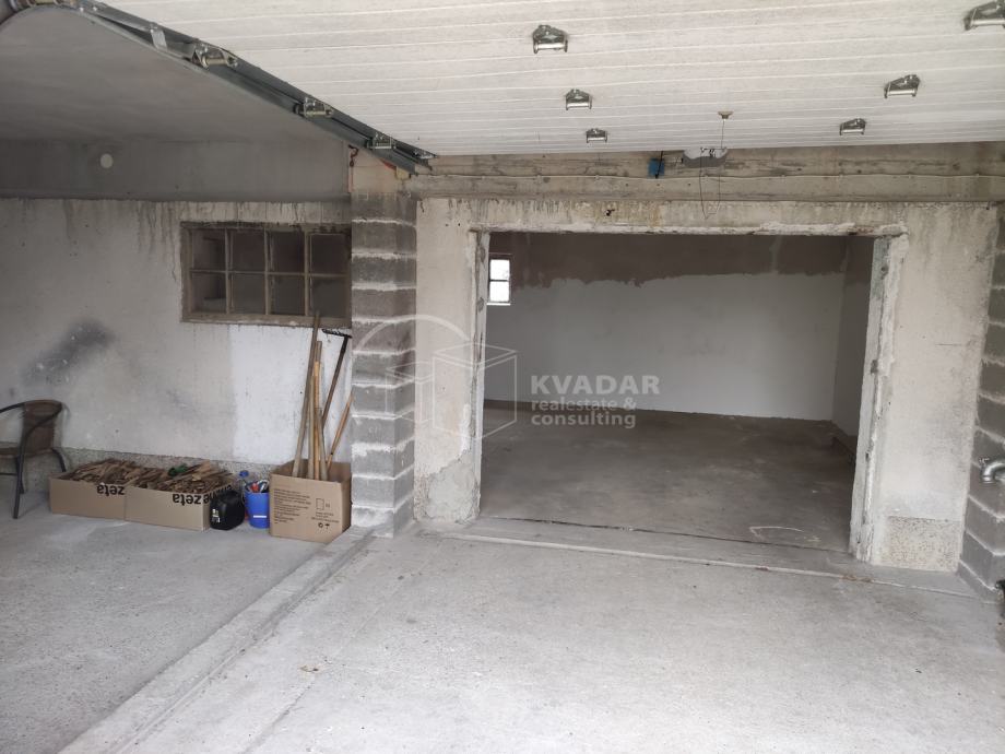 - Prizemlje: hodnik, ostava, wc, kotlovnica, alatnica, mala garaža, velika garaža