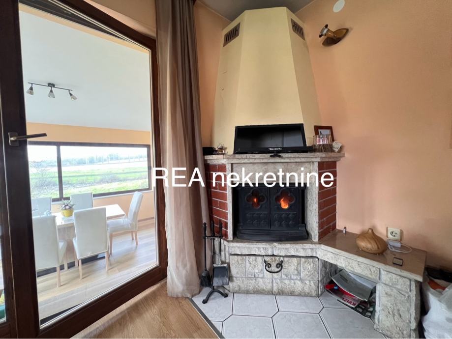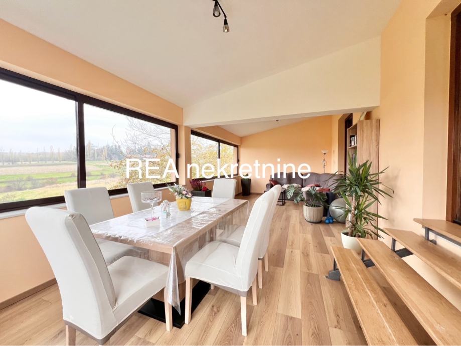 Ova kuća nudi veliki dnevni boravak s blagovaonicom, osvijetljen prozorima kroz koje se pruža pogled na zelenilo i okolna polja. U prizemlju se nalazi i kuhinja s dodatnim prostorom za sjedenje i kaminom, spavaća soba i kupaonica, dok visoko potkrovlje obuhvaća tri sobe i dodatnu kupaonicu.