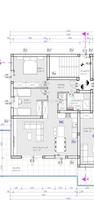 Stan je smješten na 2. katu zgrade koja je u izgradnji, te se sastoji od dvije spavaće sobe, kuhinje sa blagovaonicom, dnevnim boravkom, kupaonicom i balkonom ukupne veličine od 84.24m2. Stanu propada vanjsko ne natkriveno parkirno mjesto.