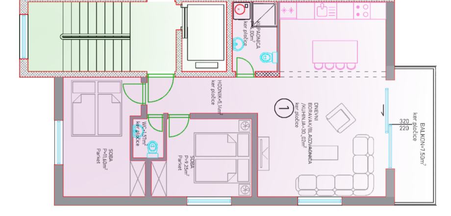 Donji Andrijevci, trosoban stan NKP 69,08 m2.Stan se nalazi na prvom katu zgrade. Sastoji se od ulaznog hodnika, dnevnog boravka s kuhinjom i blagovaonicom otvorenog tlocrta, dvije spavaće sobe, kupaonice, toaleta te balkona.Projekt stambenog naselja smješten je u miran kvart udaljen 200 m od...