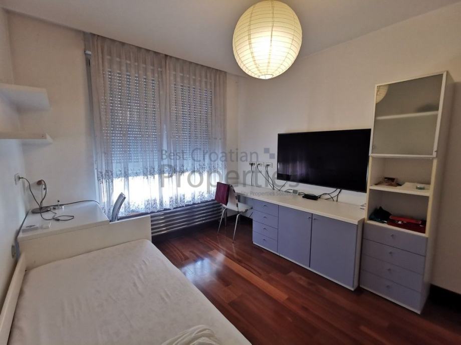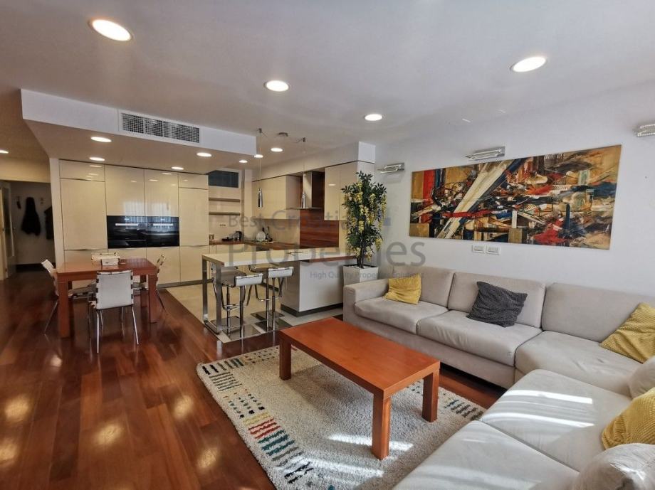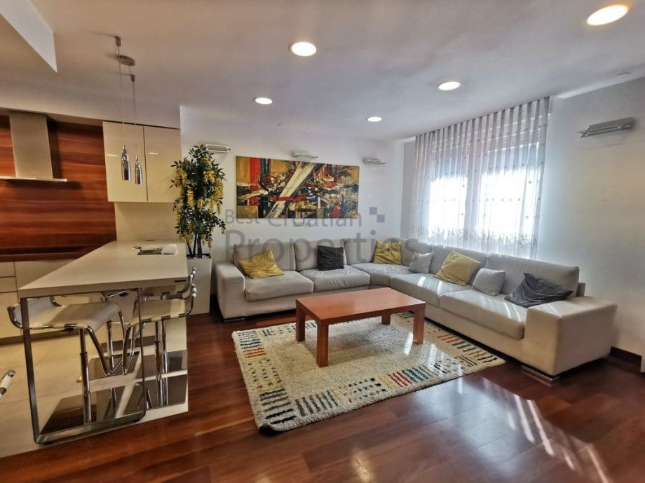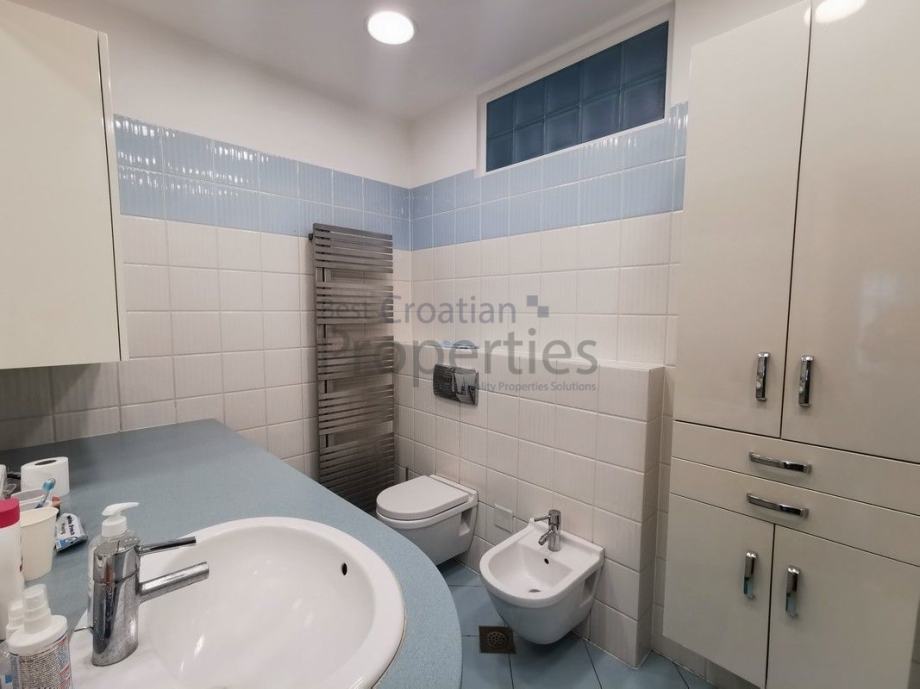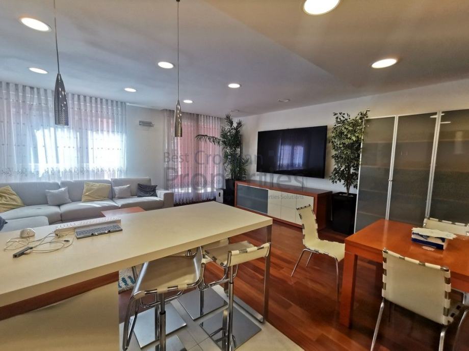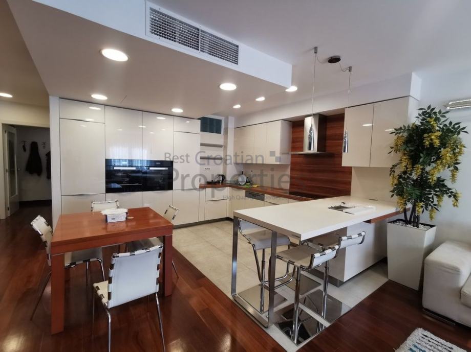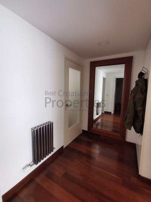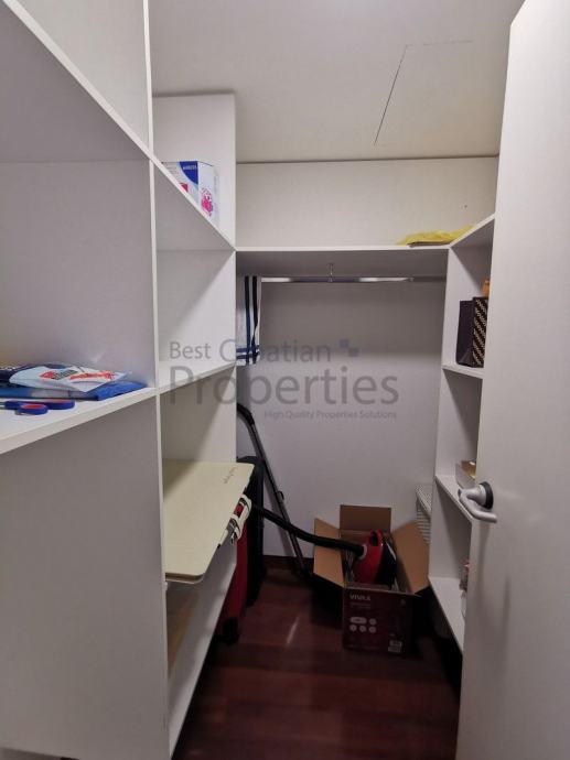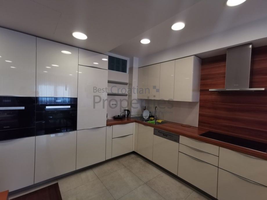 Stan je potpuno namješten i opremljen vrhunskom opremom ( MIELE - kompletna bijela tehnika, TV u svim sobama, kuhinja po mjeri potpuno opremljena, električni podizači roleta, klima, masažna tuš kabina sa saunom)