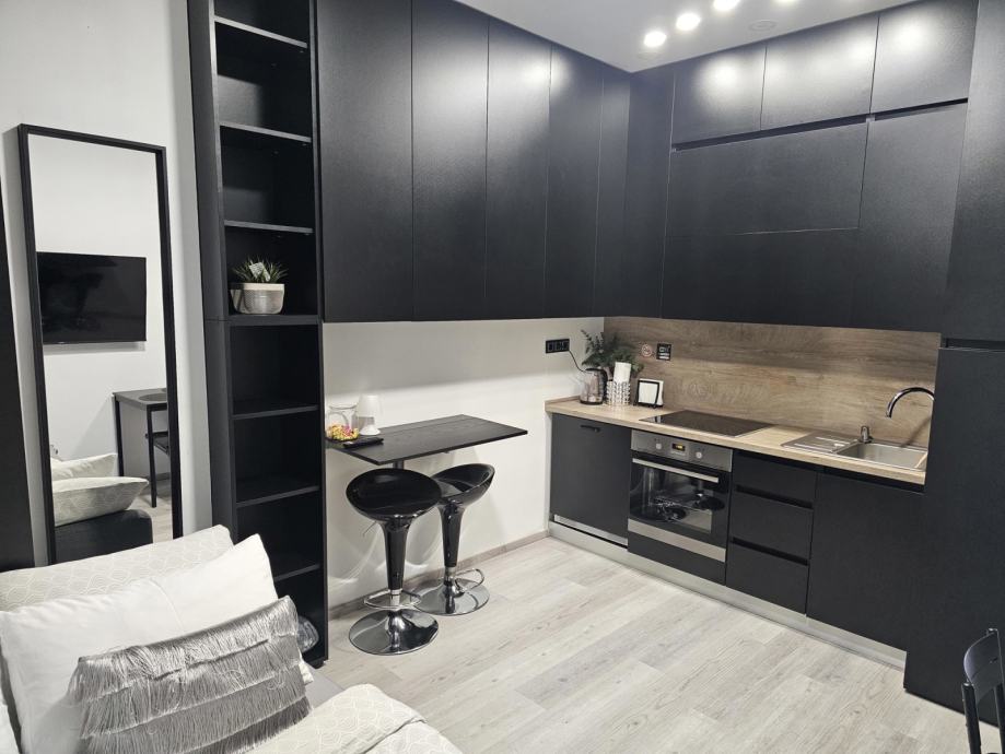 Stan je kompletno renoviran 2023. godine i funkcionalno podijeljen na dva odvojena studio apartmana (20 m² i 18 m²), svaki s vlastitom kuhinjom, kupaonicom i namještajem po mjeri.