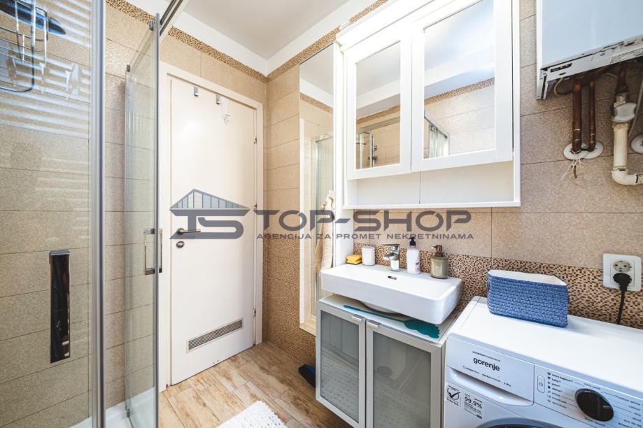 Stan je opremljen svim potrebnim kućanskim aparatima: perilicom rublja, sušilicom, perilicom suđa, štednjakom i pećnicom. U stanu su klima uređaj i podno grijanje.