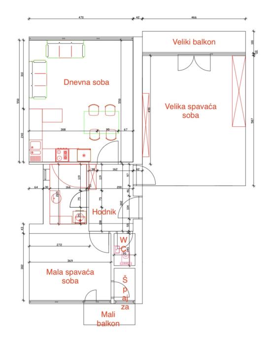 Stan se sastoji od hodnika, dnevnog boravka s kuhinjom i blagovaonicom, 2 velike spavaće sobe, kuaponice, WC-a i 2 balkona.