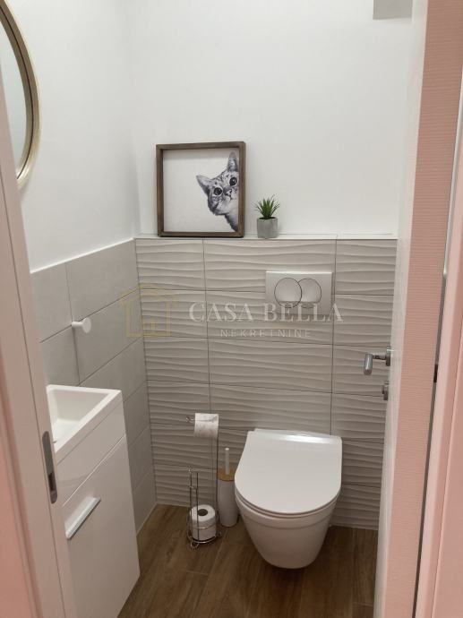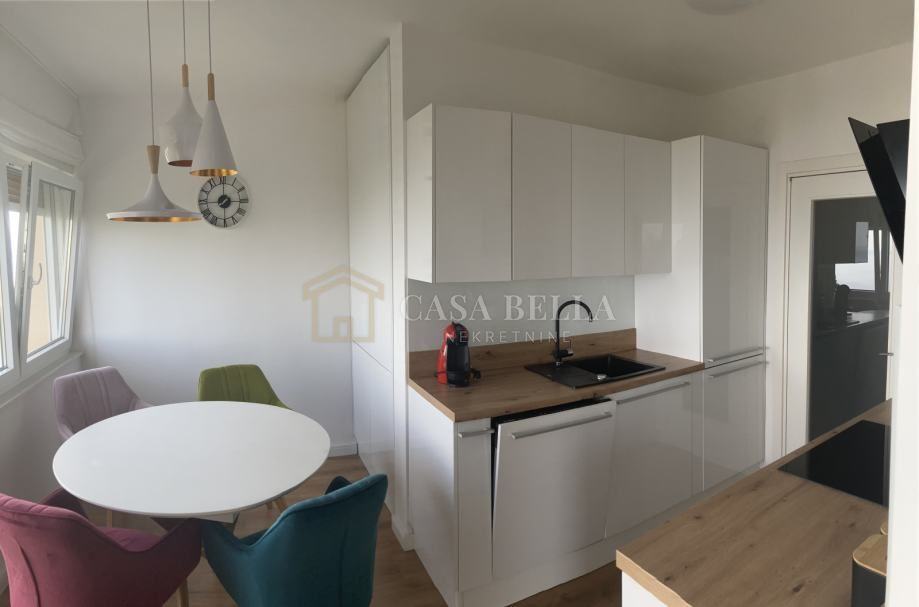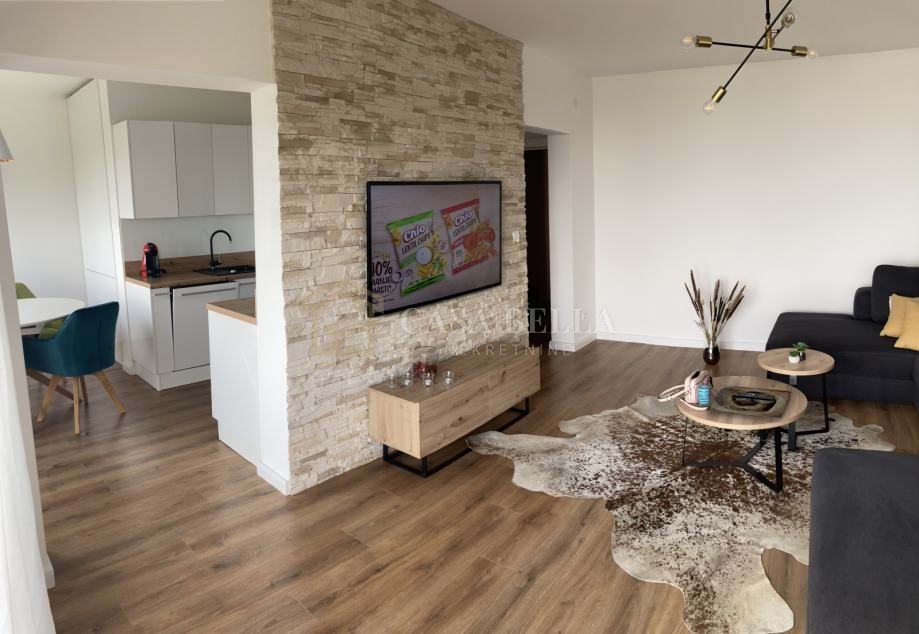 Stan je kompletno opremljen najmodernijom tehnikom, sanitarijama i namještajem poput “Hespo” kreveta s madracem, “Eduro”ugradbenih ormara, Daikin klima uređaja, podnog grijanja u kupaoni, roleta na električno podizanje.