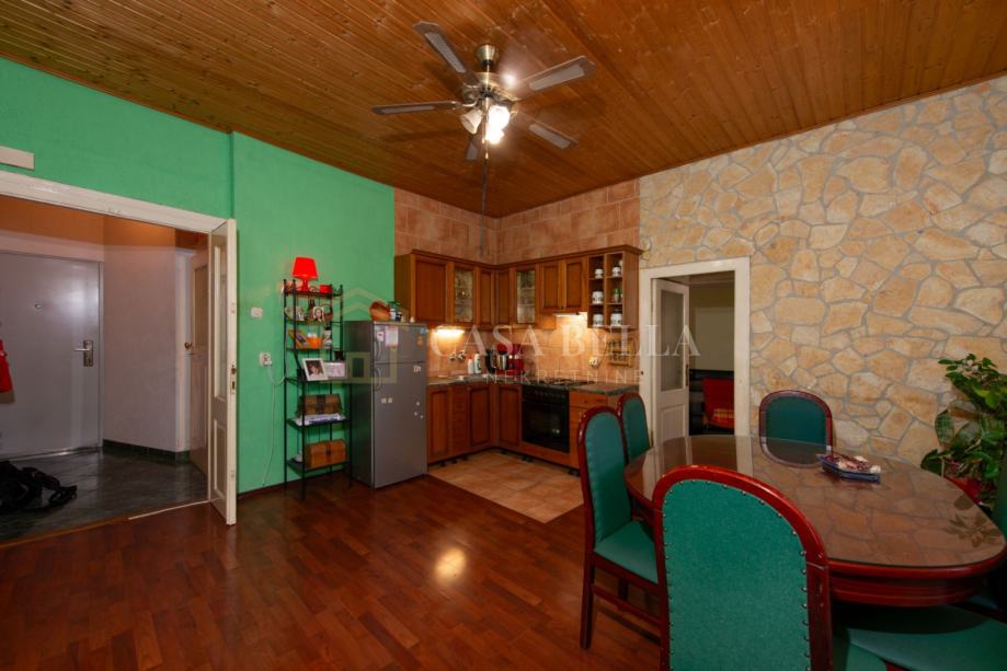 CASA BELLA iz ponude izdvaja prostrani stan od 100,39 m2, na idealnoj lokaciji, samom centru D. Zameta i u blizini apsolutno svih bitnih sadržaja. Stan se nalazi na drugom katu, potpuno obnovljene i renovirane, manje privatne zgrade, sa svega pet stanova, pa su zato i režije iznimno niske (plaća se struja, voda i odvoz smeća). Zgrada je uredna, etažirana, s novom fasadom, stolarijom i krovom. Sam stan se sastoji od ulaznog hodnika, kupaonice s WC-om, kuhinje s dnevnim boravkom, tri spavaće sobe, te velike terase s predivnim pogledom na more, od koje je polovica ostakljena, a ostatak čini nenatkriveni dio. Stan je renoviran i opremljen novim namještajem, novim instalacijama, sanitarijama, te novom stolarijom (PVC i aluminij). Velike prostorije, visokih stropova daju razne mogućnosti uređenja i prilagodbe prostora prema ukusu i u skladu sa zamislima i potrebama novog vlasnika. Stan je orijentacije jug-istok, s jedinom spavaćom sobom na sjeveru. Kao prednost ove nekretnine ističemo iznimno atraktivnu i vrlo traženu poziciju, te veliku terasu s prekrasnim pogledom. Uz stan je moguće kupiti i poslovni prostor od 12m2, u koji se ulazi direktno s ulice (odvojeno je etažiran). Čisto vlasništvo, bez tereta. Preporučamo pogledati!