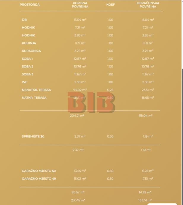 vrijednosti površine 15,66 m2 ), sveukupne korisne (neto) površine 204,21 m2 (korisne
