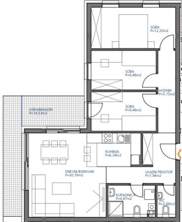 Prodaja četverosobnog stana : dnevni boravak, kuhinja, 3 spavaće soba i kupatilo, wc veličine 77,52 m2 + lođa ( 14.53m2 ) + obavezna kupnja prkirnog mjesta ( po izboru garažno, natkriveno ili nenatkriveno parkirno mjesto )